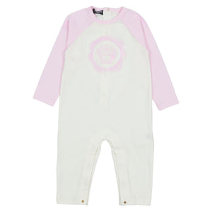 This white and pale pink babygrow set by Versace combines luxury and comfort. Made from soft cotton jersey, the babygrow features pale pink raglan sleeves with the iconic Medusa logo on the front and a bold pink logo printed on the back for a statement finish.