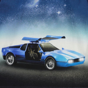 This Molo long-sleeve top features a vibrant blue sports car with gull-wing doors open, parked under a brilliant, galaxy-inspired night sky.