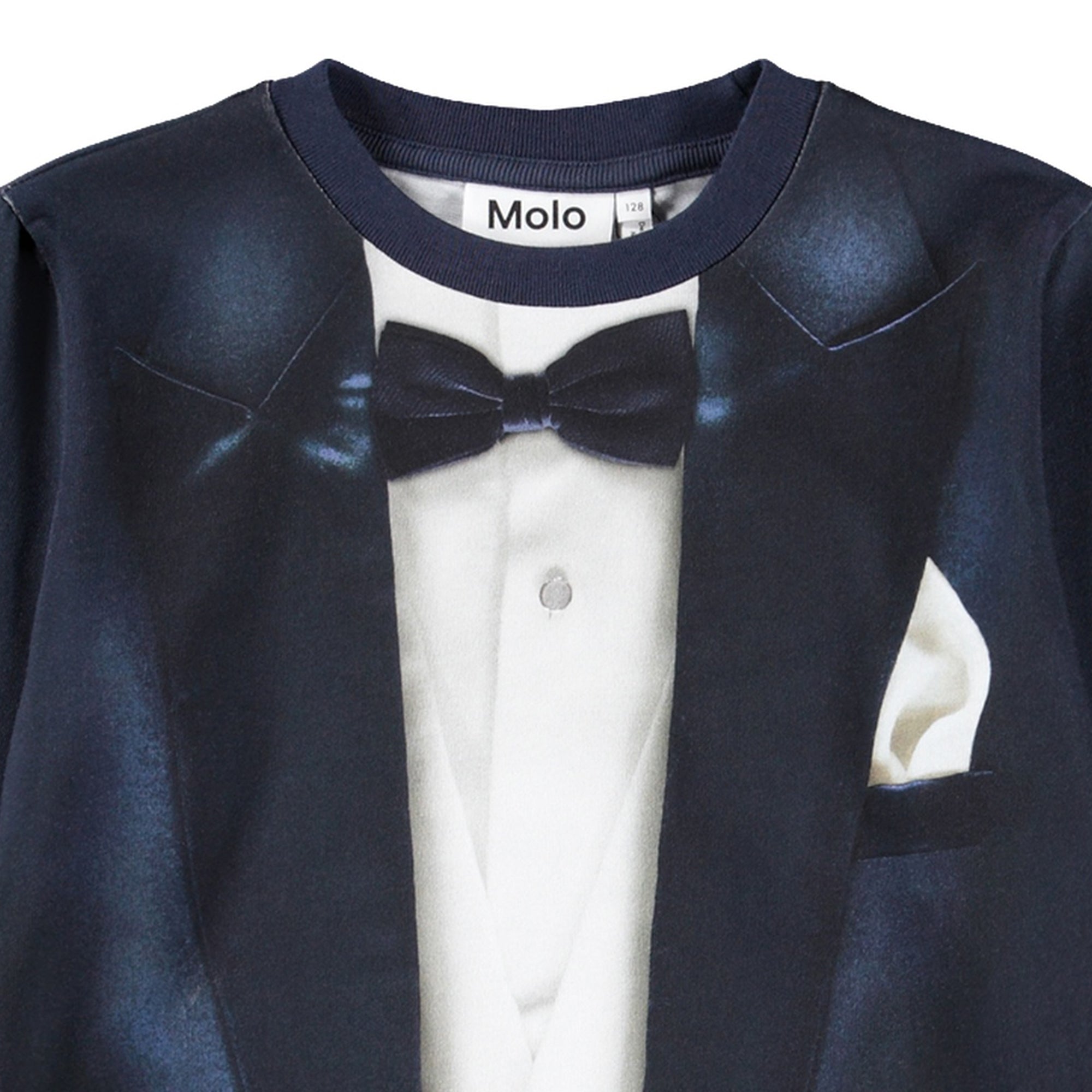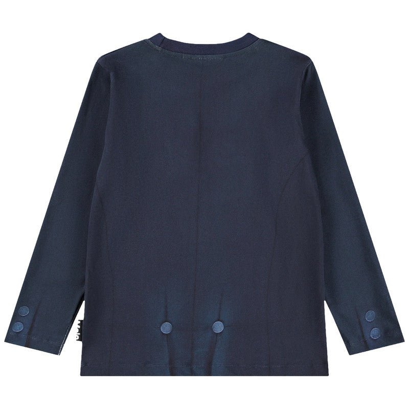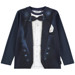 Navy blue long-sleeved T-shirt by Molo, featuring a cool tuxedo graphic on the front. Made in soft organic cotton jersey, this comfortable top showcases a realistic print of a dapper tuxedo, complete with waistcoat, pocket square, and bow tie.
