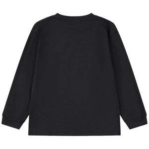 Black organic cotton top by Molo, made in soft and comfortable jersey. This relaxed, casual style has dropped shoulders and ribbed trims, with a fun cat on a skateboard print on the front.