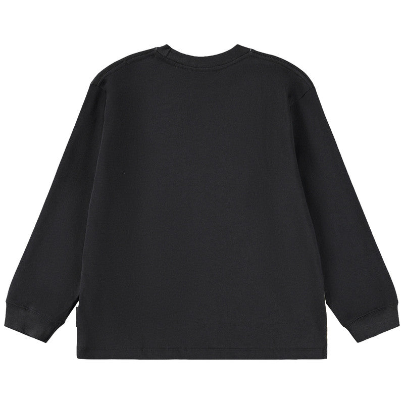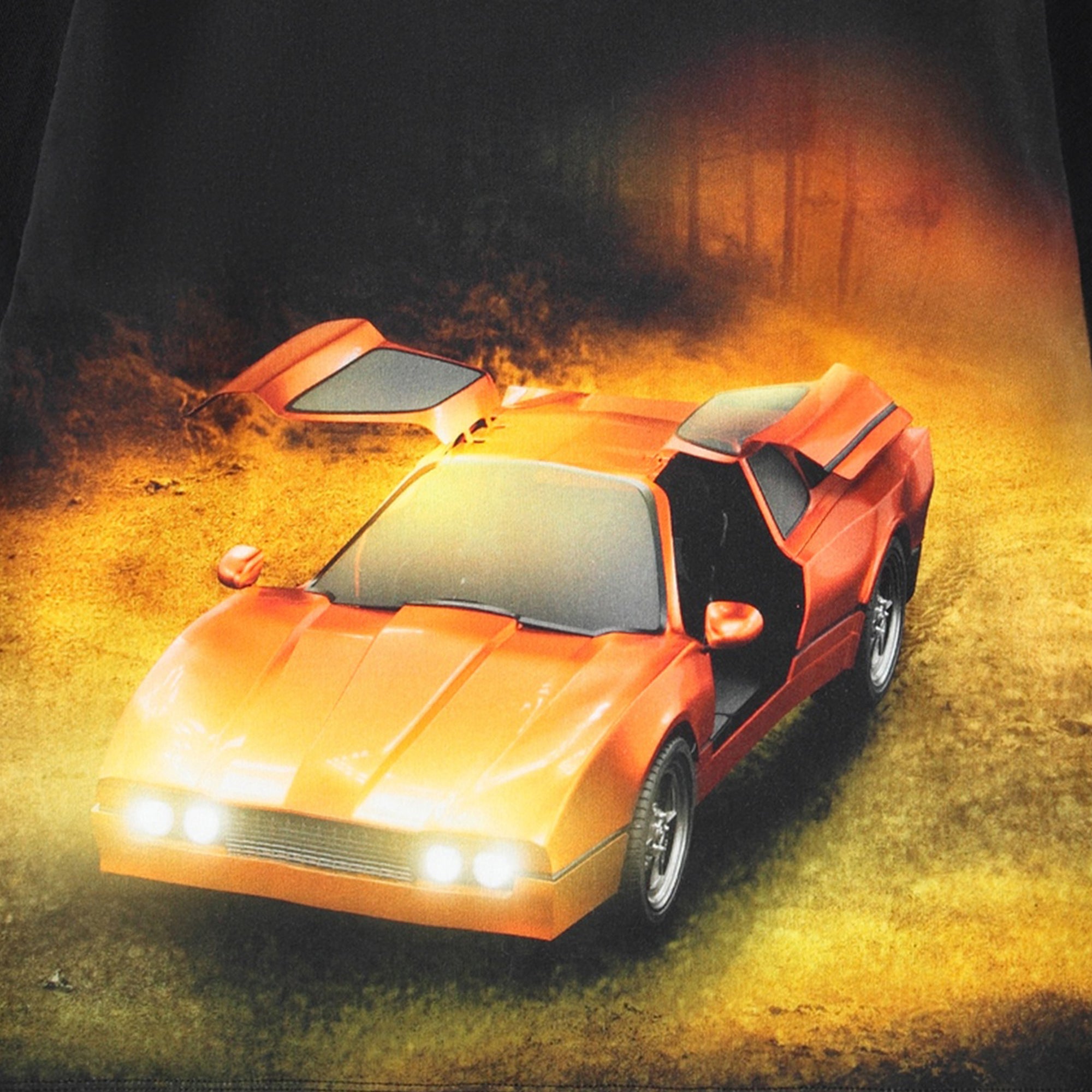 This black Molo long-sleeve shirt showcases a blazing orange sports car with open doors, emerging from a dark, fiery, forest setting.