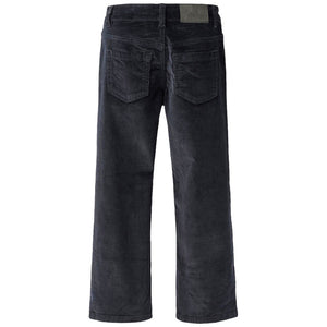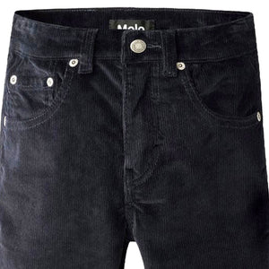 This Molo navy pants made of ribbed corduroy with five pockets, wide legs and zip fly. The pants are inspired by the skateboarding scene and have a relaxed, loose fit.