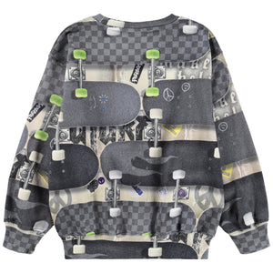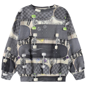 This Molo cool grey sweatshirt featuring a dynamic all-over print of overlapping skateboards, checkered grips, and neon green wheels for ultimate street style.