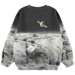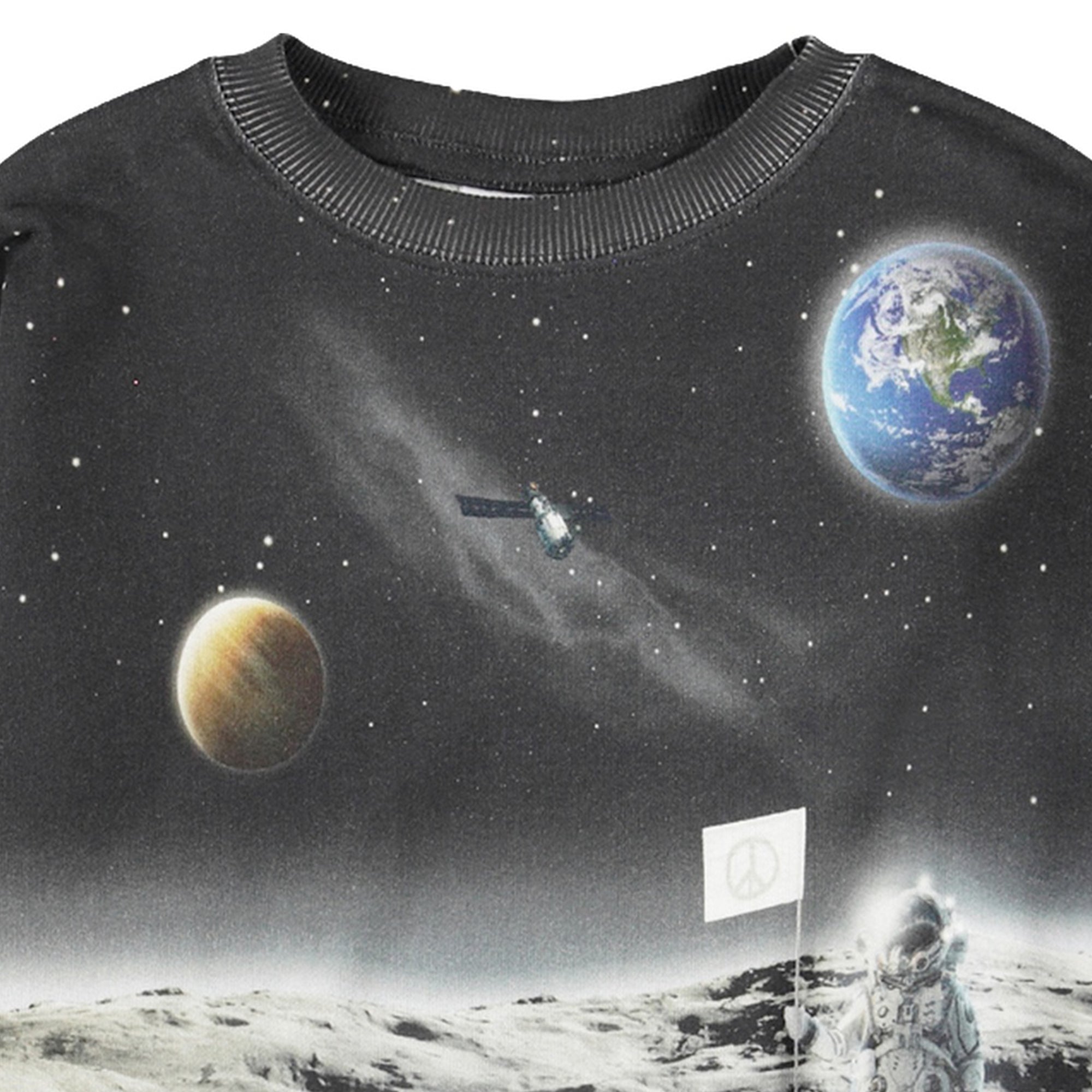 This Molo bold sweatshirt featuring an astronaut standing on the Moon's surface with Earth and planets visible in the starry, galaxy-printed sky.
