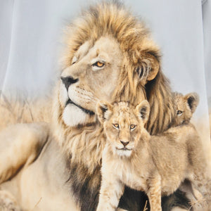 This Molo Cozy sweatshirt with a stunning photorealistic print of a proud adult lion and two cubs resting in the golden African savanna.