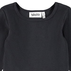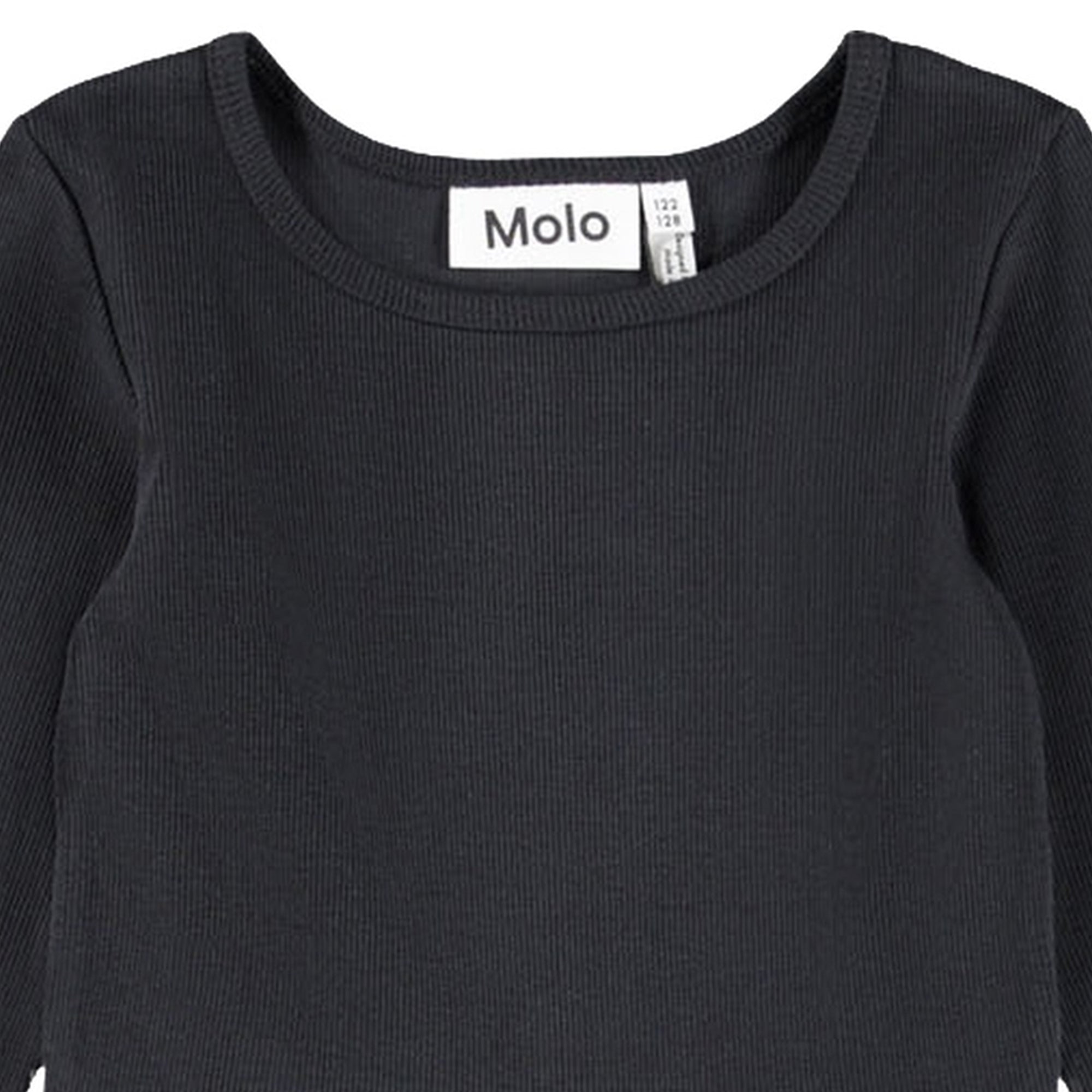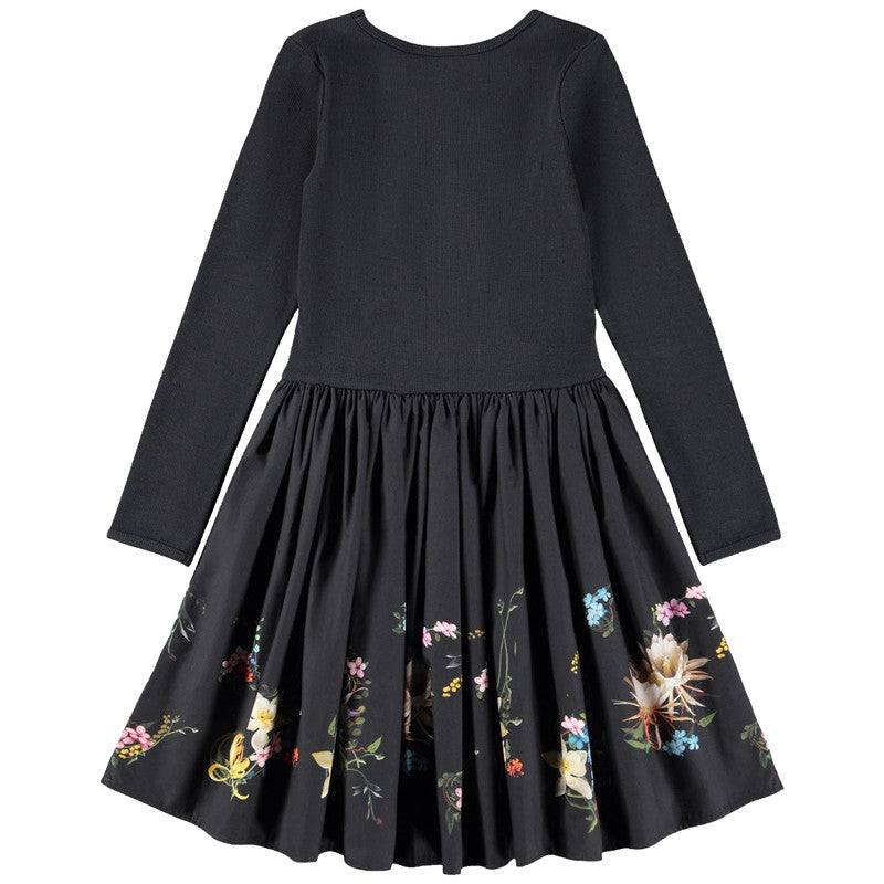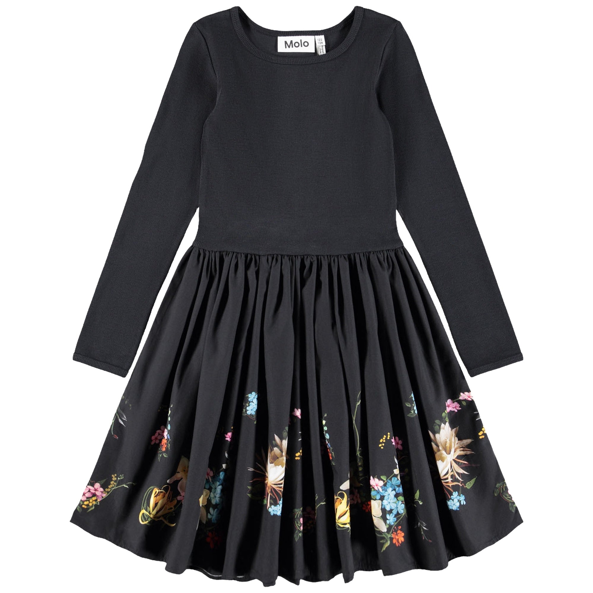 This long-sleeved black dress from Molo features a comfortable 100% cotton design with a soft ribbed jersey top and a poplin skirt adorned with a charming floral print. Perfect for any occasion, this dress offers a regular fit that ensures freedom of movement and easy comfort throughout the day. Ideal for kids who love style and practicality, this Molo dress blends durability with an eye-catching look.