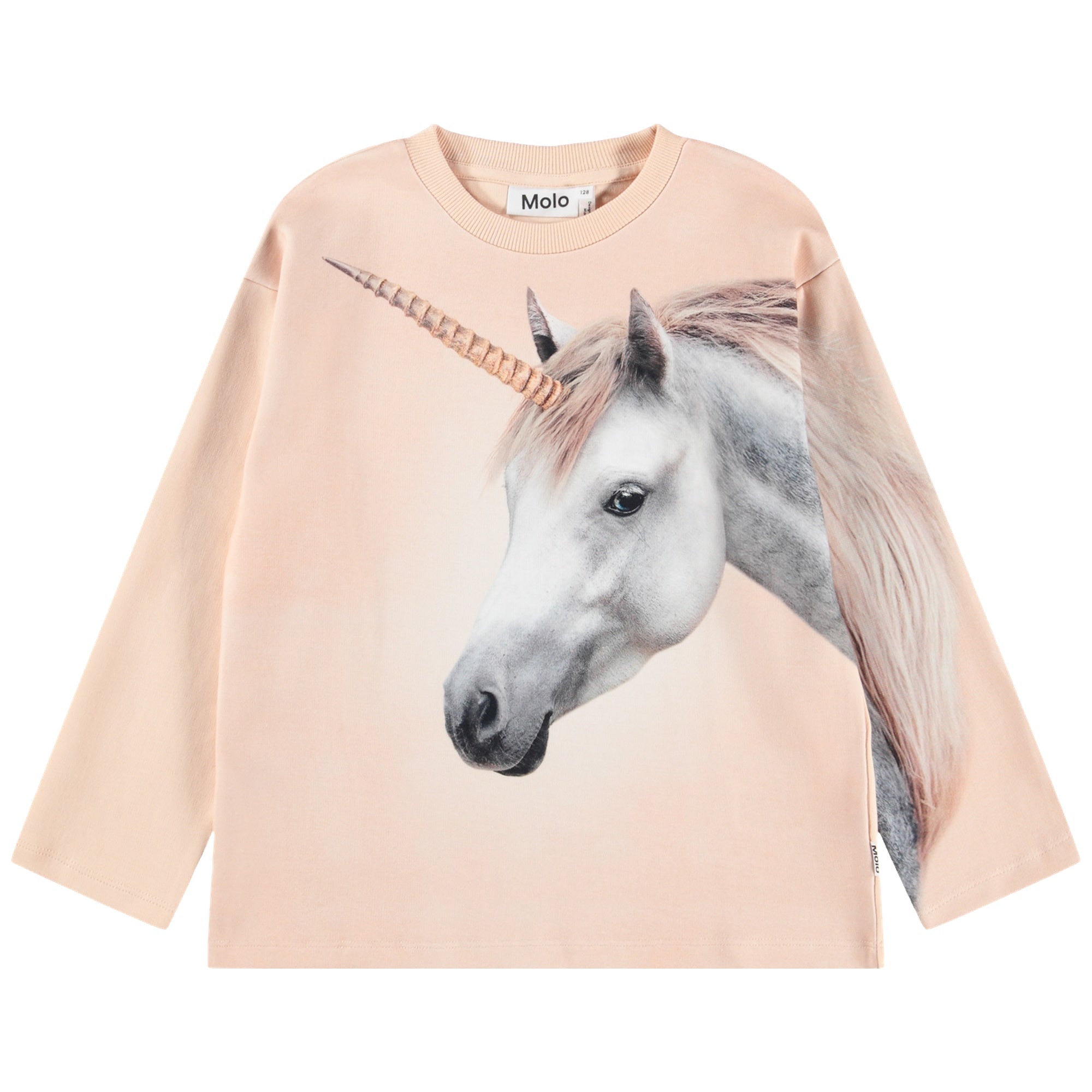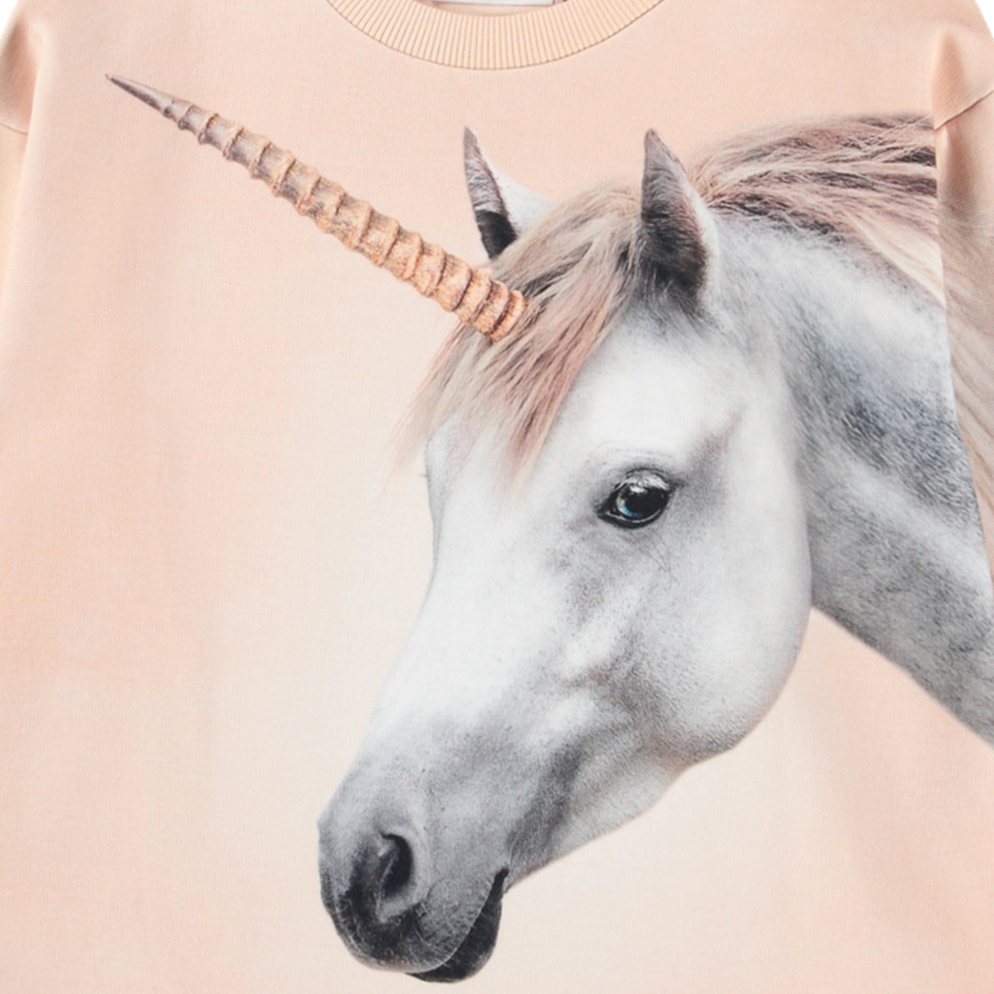 This Molo Rose sweatshirt made of organic cotton with a round neckline with ribbed edges, long sleeves and a regular fit. The sweatshirt has a beautiful large print of a unicorn.