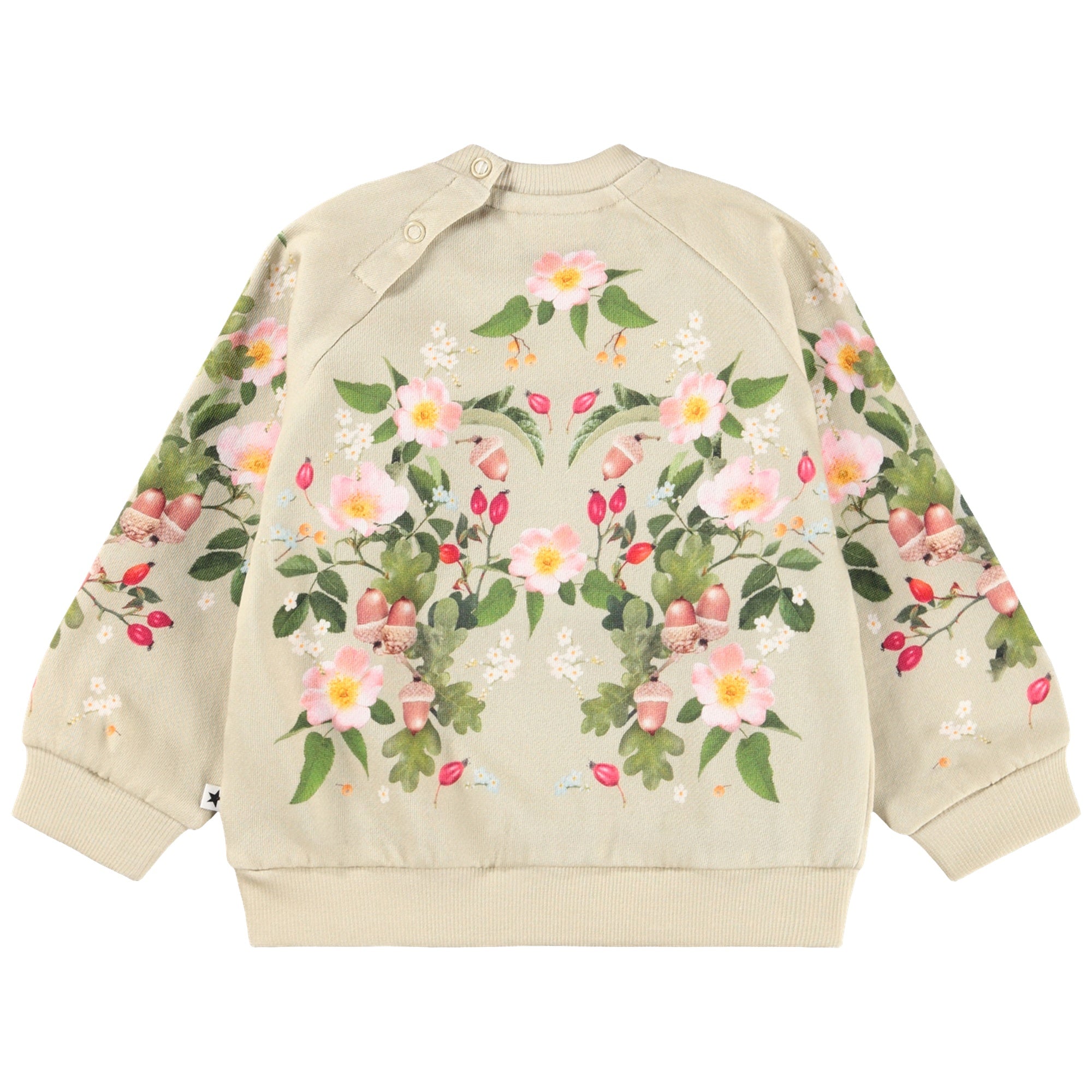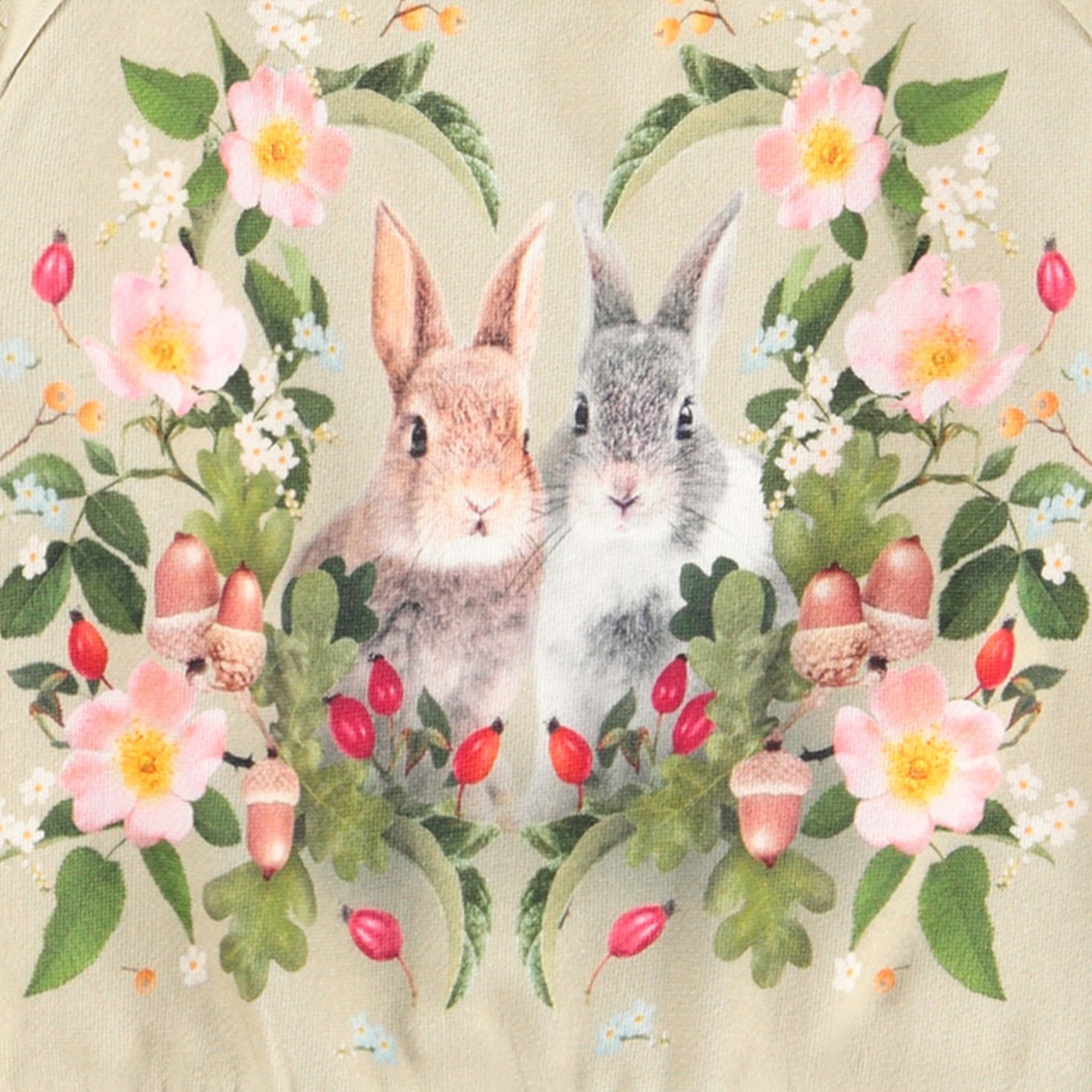 This Molo Soft sweatshirt for the little ones made of organic cotton. It is light green with a print of rabbits and flowers. The sweatshirt has raglan sleeves, ribbed edges and a round neckline with button closure behind the shoulder to make it easy to take off and put on.