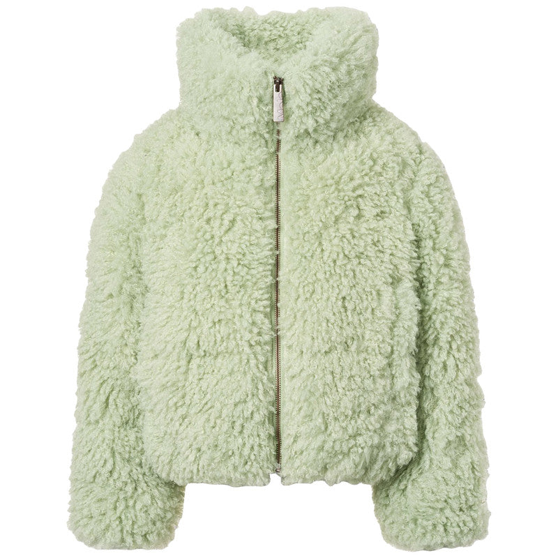In pale mint green, this stylish faux fur jacket by Molo. Beautifully soft and super fluffy, it is ideal for keeping warm in the colder months. Lined in silky satin and gently padded for extra cosiness, it features a high collar and full-length zip.