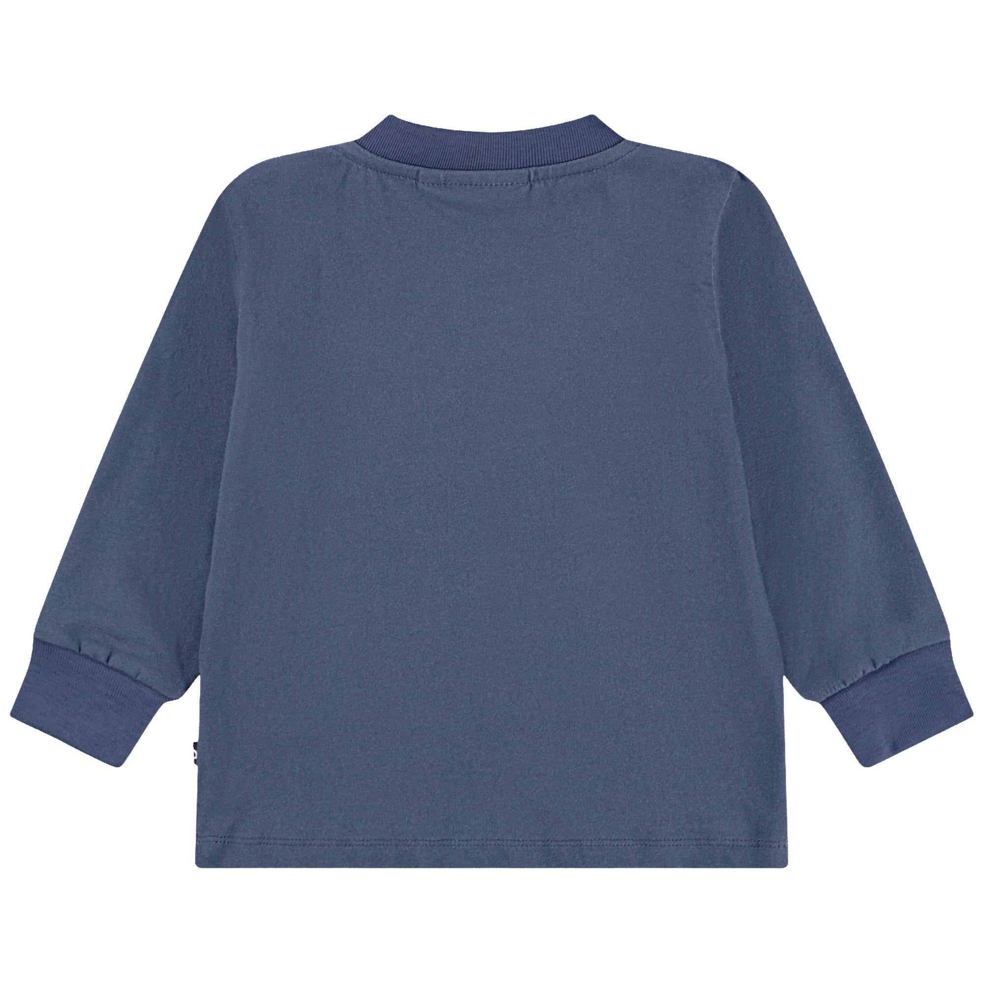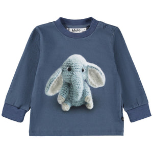 Dark blue long-sleeved top for the little ones made of organic cotton jersey. On the long-sleeved top, there is a print of a crocheted baby elephant. The long-sleeved top offers good flexibility, long sleeves and ribbed cuffs. It also has two snap buttons on the left shoulder to make it easy to put on.