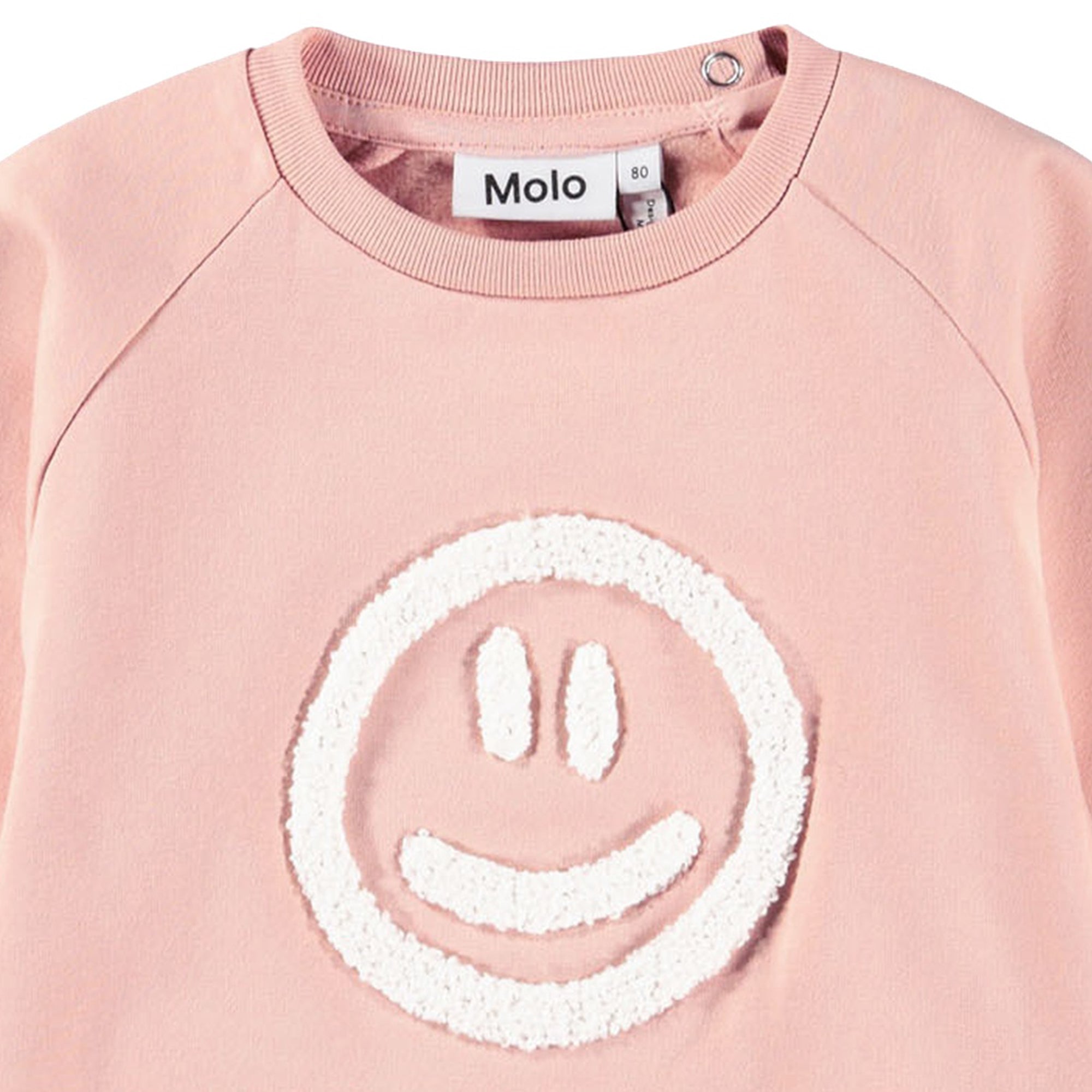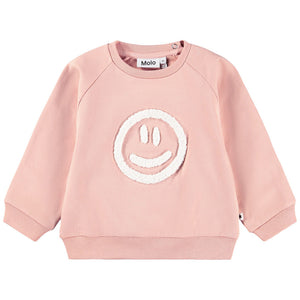 Peach sweatshirt by Molo, made in soft organic cotton jersey with a warm, fleecy inside. Casual and cosy, it features a white bouclé smiling face on the front, adding a fun touch to any outfit. It has a ribbed hem and cuffs and raglan sleeves with popper fastenings on the back of one shoulder.