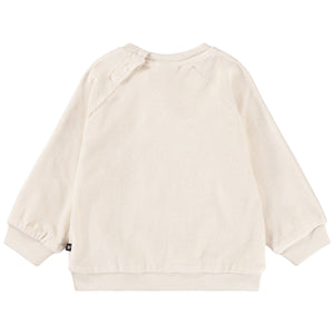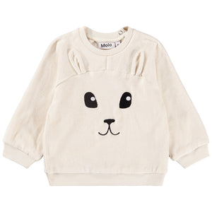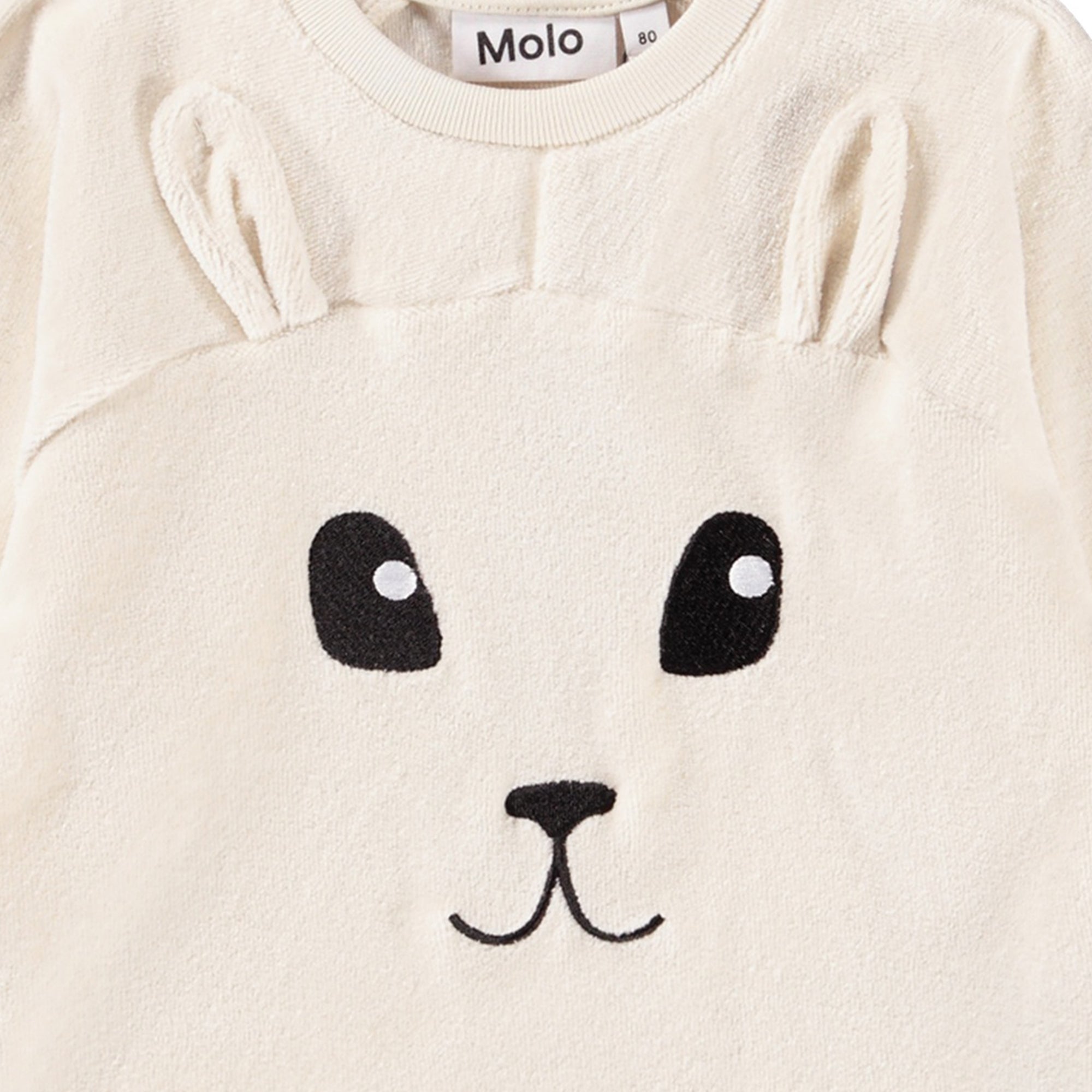 Ivory velour sweatshirt by Molo, made in soft organic cotton. This cosy top features a cute embroidered animal face on the front, with 3D ears for added playfulness. It has a ribbed hem and cuffs and raglan sleeves with popper fastenings on the back of one shoulder for easy dressing.