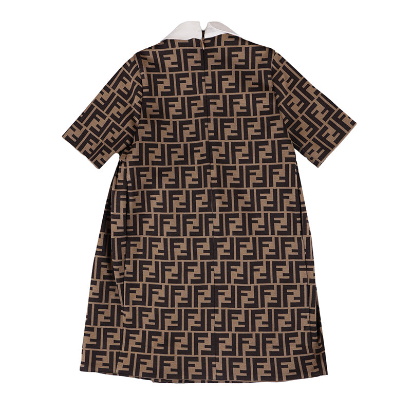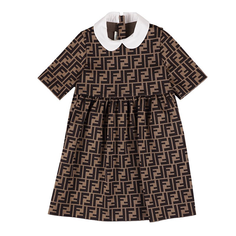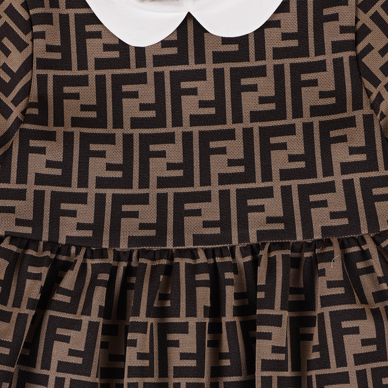 Jacquard fabric baby girl dress with tobacco brown, all-over FF logo and white collar.