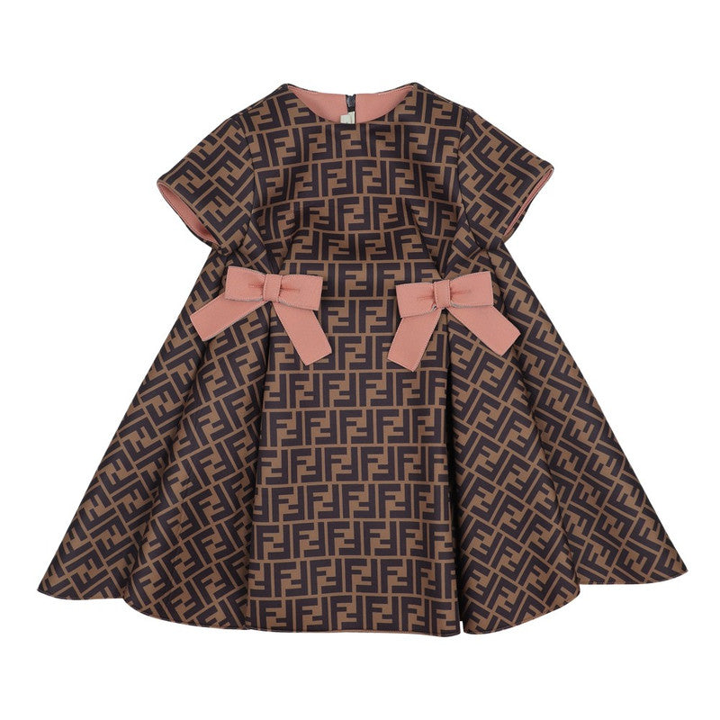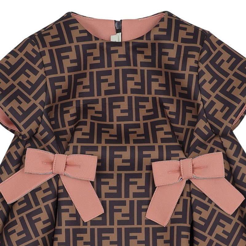 Fendi embody high quality craftsmanship designs with refined elegance. This dress captures the luxury Italian label's preference for sleek, uncomplicated fashion. Crafted in beautiful Neoprene quality in tobacco brown via all-over FF logo patterning and pink bows.