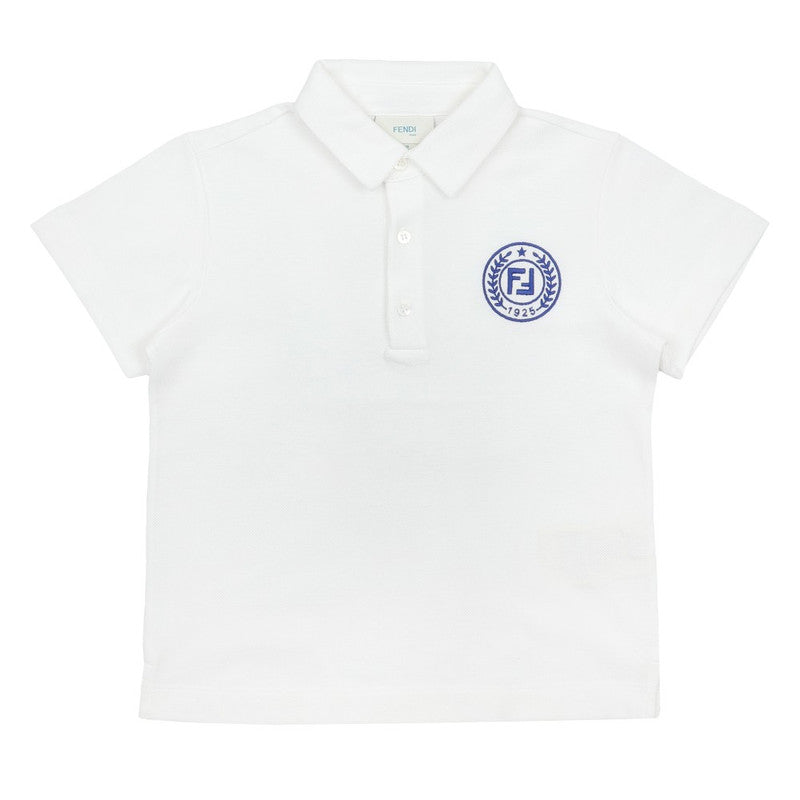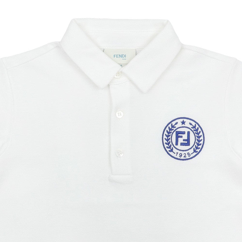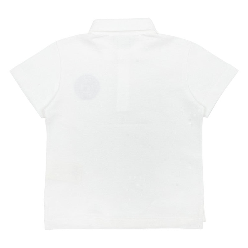 Chalk white classic Pique junior polo shirt with mother of pearl buttons and blue stamp thread embroidery.