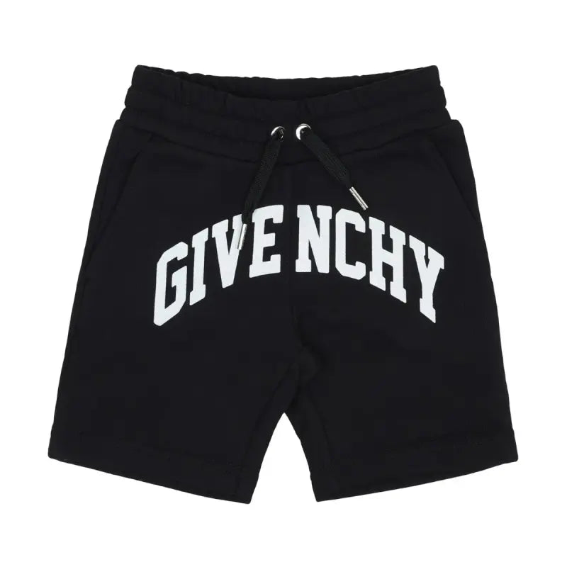 Black shorts for little boys by Givenchy, made in soft, mid-weight cotton sweatshirt jersey. These casual shorts have slanted front pockets and a patch pocket on the back with a white 4G logo. The waistband has a drawstring for a comfortable fit and there is a bold white logo printed across the front for a stand-out designer finish.