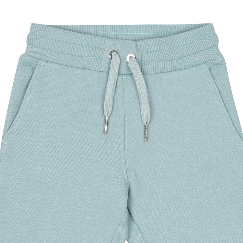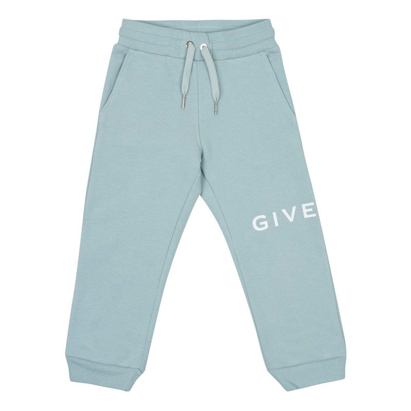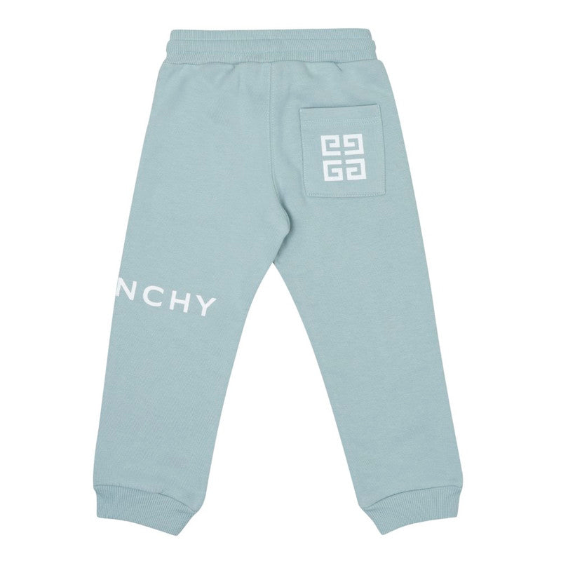 Sage green joggers for little boys by Givenchy, made in soft, mid-weight cotton jersey. These cosy joggers have a white logo print wrapped around one leg and the signature 4G logo print on the back pocket. They have two slant pockets on the front, stretchy ribbed cuffs and a gently elasticated waistband with drawstring ties for a comfortable fit.