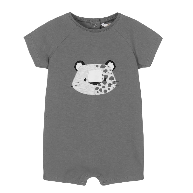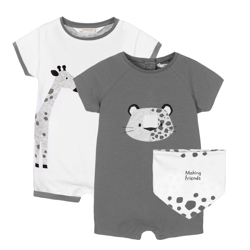 Grey cotton jersey shortie set for baby boys by Mayoral Newborn, comprising two shorties and white and grey bib. The grey shortie has a cute safari animal print and fastens with poppers on the back and between the legs. The grey and white shortie has an adorable giraffe and zebra appliqué on the front.