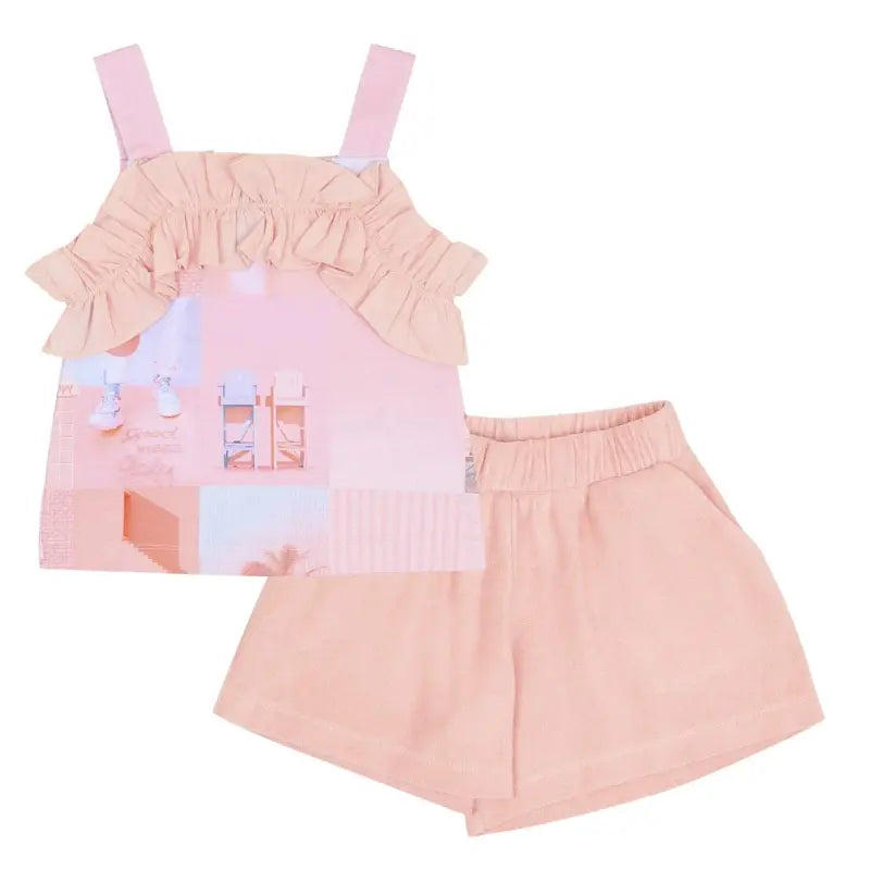 Coral pink shorts set for girls by Lapin House. Patterned with holiday-themed prints, the sleeveless top is made in soft and stretchy cotton jersey and detailed with a fabulous, woven ruffle across the square neckline.