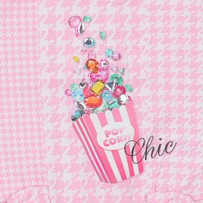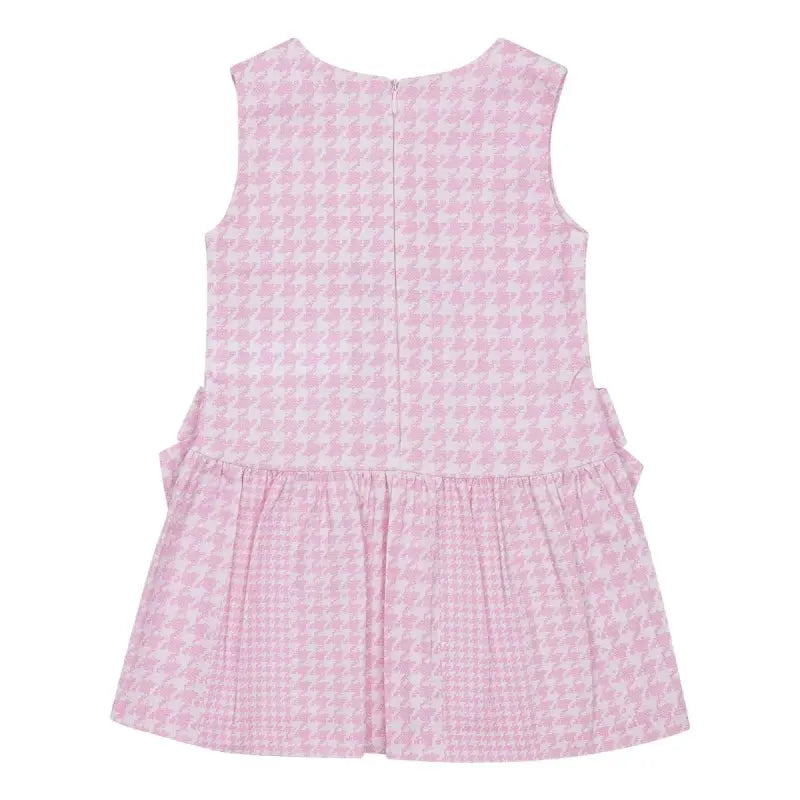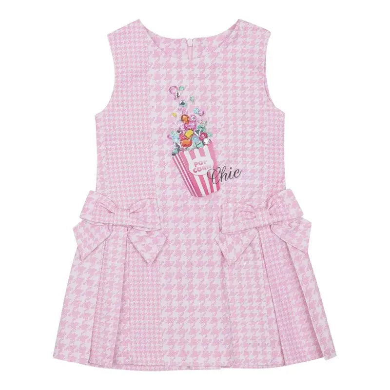 This adorable pink houndstooth dress for baby girls features playful popcorn-themed print, charming side bows, and a pleated design. Perfect for special occasions or adding a chic touch to everyday wear!
