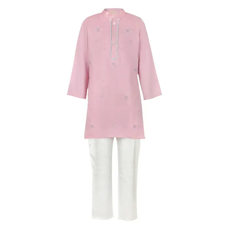 A mauve beaded kurta koti set for boys with intricate pearl detailing, ideal for special occasions and festive events.