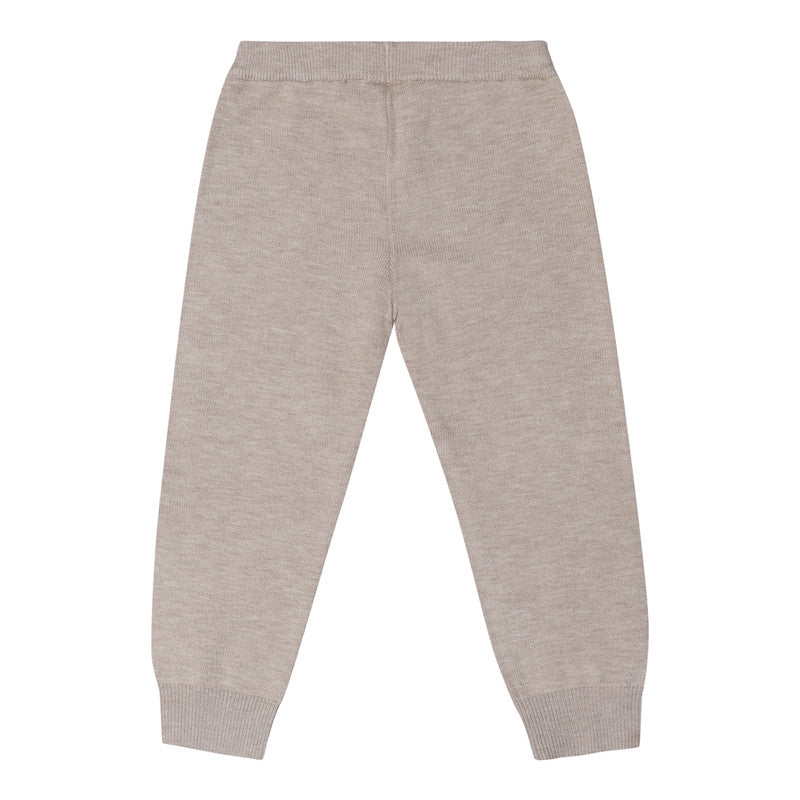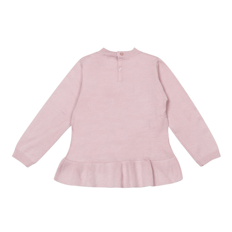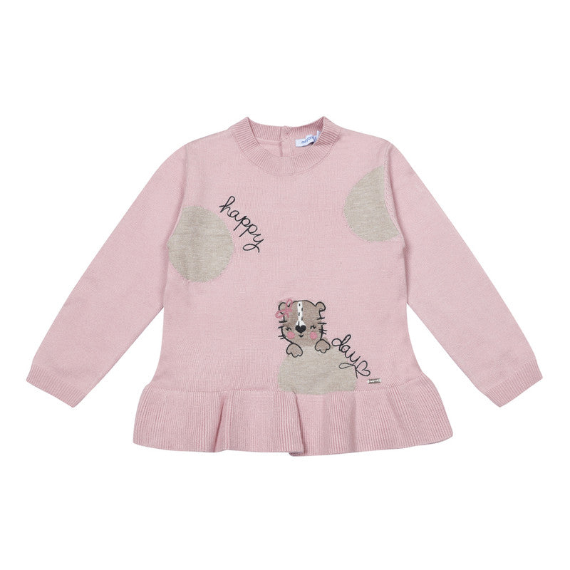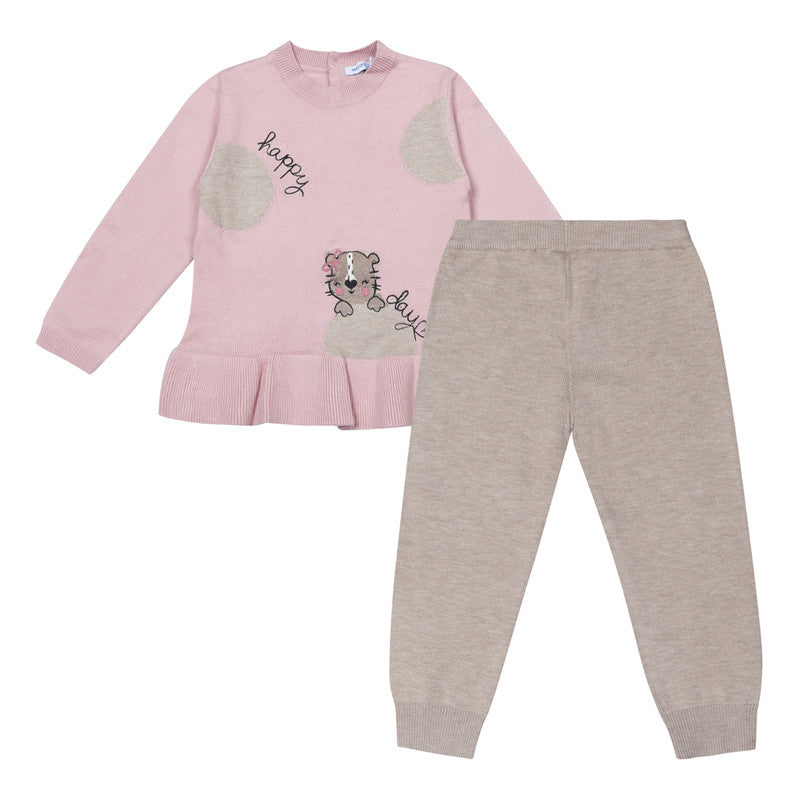 A pink and beige trouser set for younger girls by Mayoral, made in a soft and cosy viscose-blend knit. The sweet top has a ruffle hem and a little beige cat design on the front, with 'Happy Day' embroidered in black. It fastens with shimmering pink buttons on the back. Completing the set are trousers with an elasticated waist for simple, fuss-free dressing and changing.