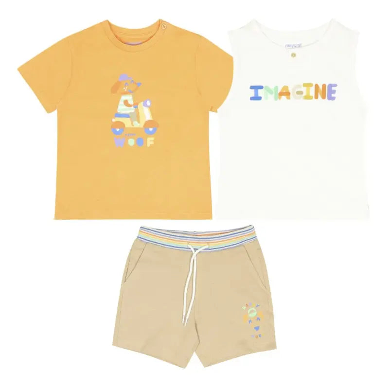 The short-sleeved T-shirt has a fun dog print on the front with a slogan that reads 'Happy Woof'. There is a wooden button and a concealed popper on one shoulder. When the temperature warms up, the blue sleeveless vest has a colourful slogan on the chest and a rainbow tab on the side seam. The matching shorts have a coordinating print on the leg, along with slanted front pockets and a striped waistband. Drawstring ties ensure a more secure fit.