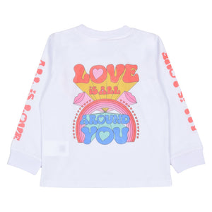 The Stella McCartney Kids white T-shirt for girls with heart print is available on the RubinoKids.com online store. Made of 100% fabric, it features a white heart print, long sleeves, a crew neck, and a graphic print.