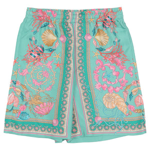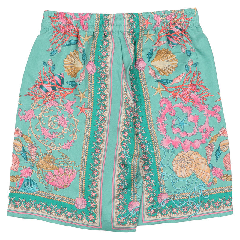 Make a splash with these vibrant teal shorts featuring a stunning marine-themed print with shells, coral, and starfish in pink and gold tones. The lightweight fabric and comfortable elastic waistband make them the perfect stylish piece for warm weather or poolside fun.