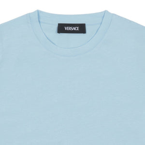Pastel blue T-shirt by luxury Italian label Versace, made in soft cotton jersey. This casual tee has a tonal 9's Vintage Logo printed on the one side for instant brand appeal.