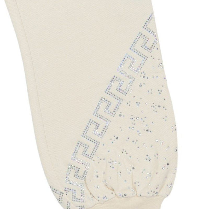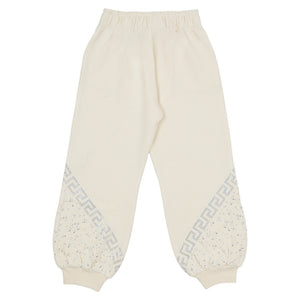 These elegant cream fleece sweatpants are elevated with sparkling designer details. They feature a cozy, comfortable fit and an elasticated waist and cuffs. The lower legs are adorned with shimmering silver rhinestones forming a Greca pattern border, mixing casual comfort with high-fashion flair.