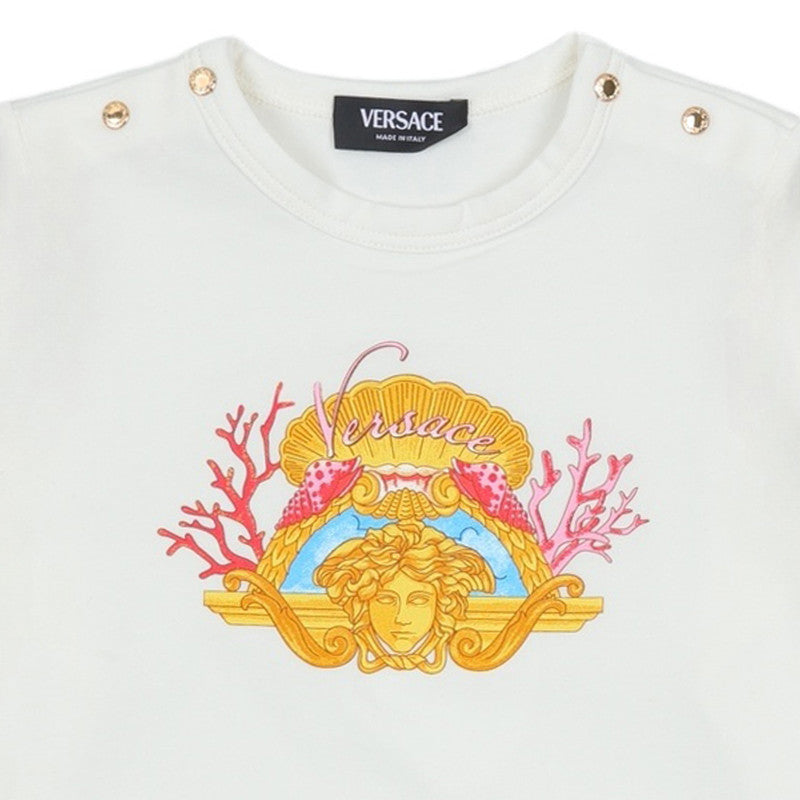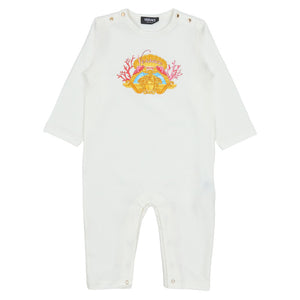 An off-white romper by luxury Italian designer Versace, featuring a striking coral motif with the iconic Medusa on the front. This comfortable babysuit is made in soft cotton jersey with branded gold tone poppers on the shoulders, with further ones between the legs for easy dressing.
