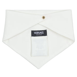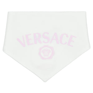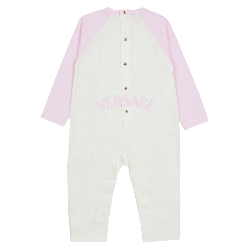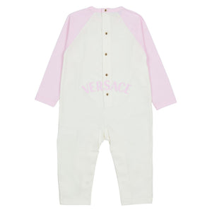 This white and pale pink babygrow set by Versace combines luxury and comfort. Made from soft cotton jersey, the babygrow features pale pink raglan sleeves with the iconic Medusa logo on the front and a bold pink logo printed on the back for a statement finish.