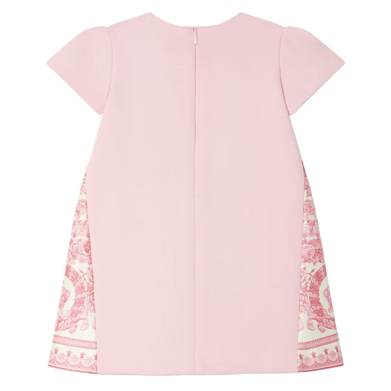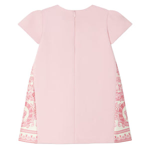 A short-sleeved shift dress in a stretch jersey Milano-stitch featuring satin-trimmed side panels in the Barocco Foulard print and accent Medusa snap buttons.