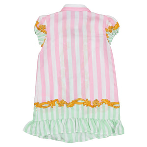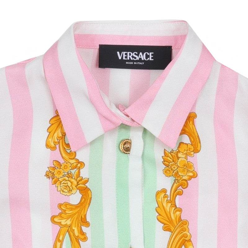 A silk twill dress featuring a pastel pinstriped print with a Barocco Leaf motif. The short-sleeved style is accented by signature Medusa buttons and a flared hem.