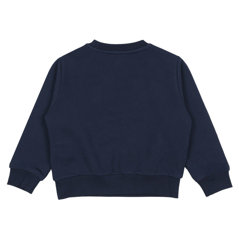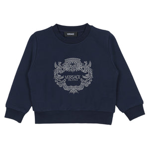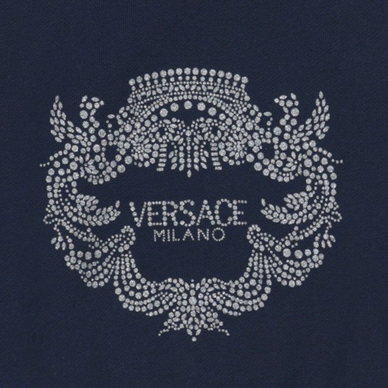 Navy blue sweatshirt by luxury Italian brand Versace, with a sparkling, diamanté-embellished crest logo on the front for instant brand appeal. Casual yet stylish, it is made in mid-weight cotton jersey.