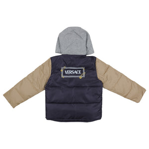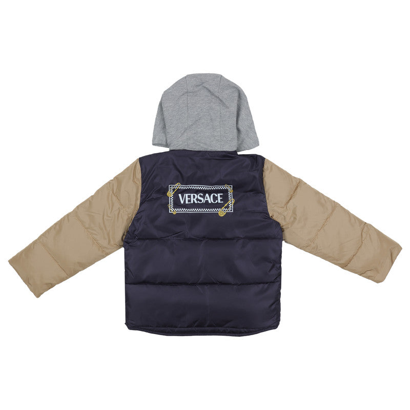 A cozy, warm padded puffer jacket featuring a Safety Pin Logo at the back, a cotton-jersey hood, and mother-of-pearl Medusa snap buttons.