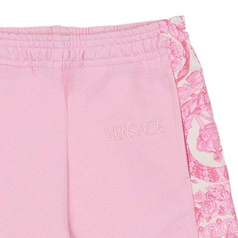 These pale pink joggers are unmistakably by luxury Italian brand Versace, combining a sporty look with designer style. Made in soft, comfortable cotton jersey, they have silky side panels patterned with the brand's iconic Barocco Foulard design in pink and ivory. There are useful side seam pockets on the front and a tonal embroidered logo for a signature finish.