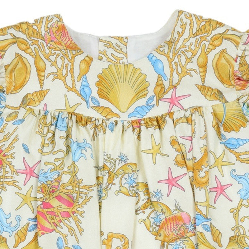 This elegant, ivory and gold dress by Italian label Versace, is made in beautifully soft and lightweight silk twill. Lovely for a special occasion, it is patterned with the luxury brand's ornate Underwater Barocco print, featuring colourful shells, coral and starfish motifs.
