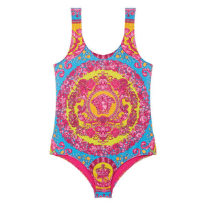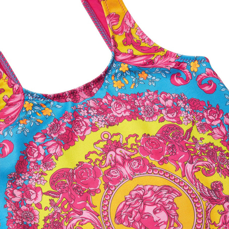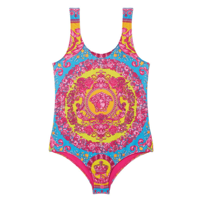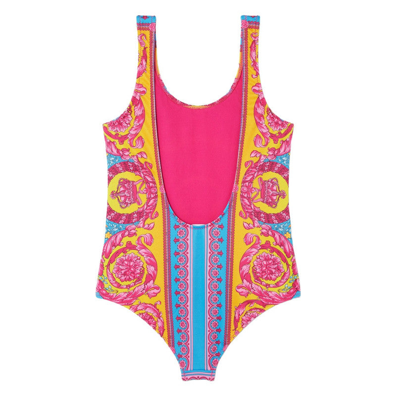 This Vibrant Swimsuit For Younger Girls By Luxury Label Versace, Showcases The Italian Brand'S Signature Electric Barocco Print In Striking Shades Of Pink, Blue And Yellow