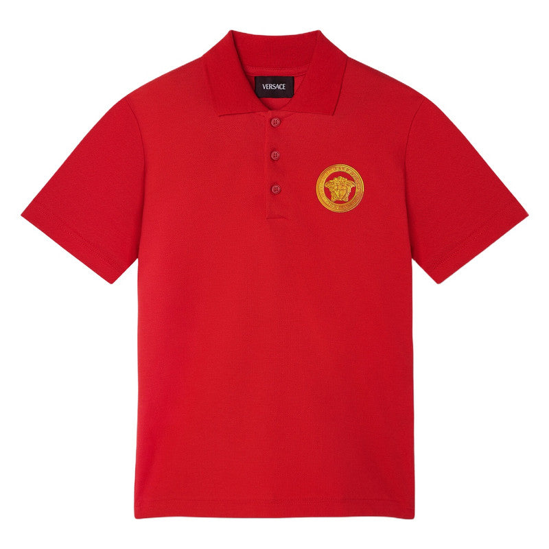Versace Red Pique Polo Shirt With Gold Medusa Logo