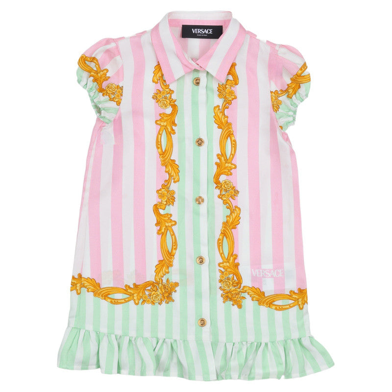 A silk twill dress featuring a pastel pinstriped print with a Barocco Leaf motif. The short-sleeved style is accented by signature Medusa buttons and a flared hem.