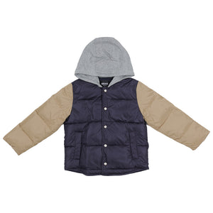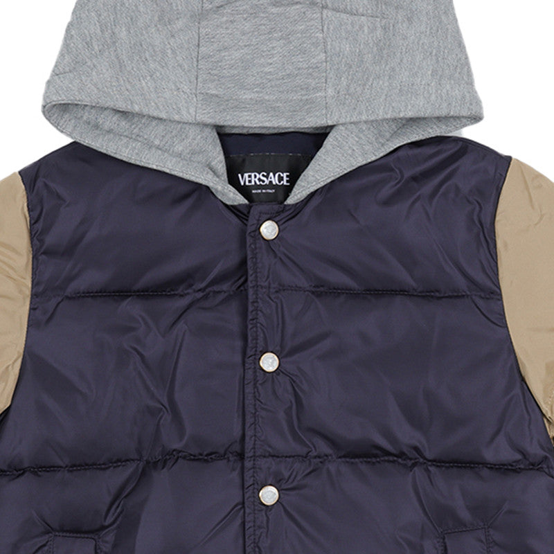 A cozy, warm padded puffer jacket featuring a Safety Pin Logo at the back, a cotton-jersey hood, and mother-of-pearl Medusa snap buttons.