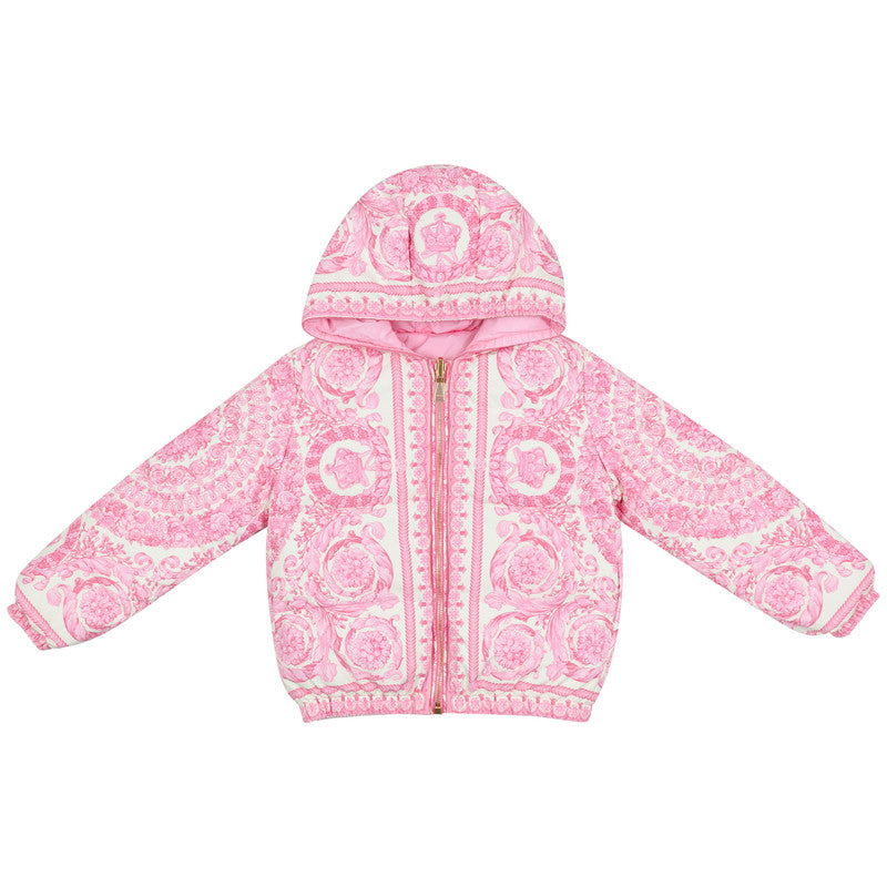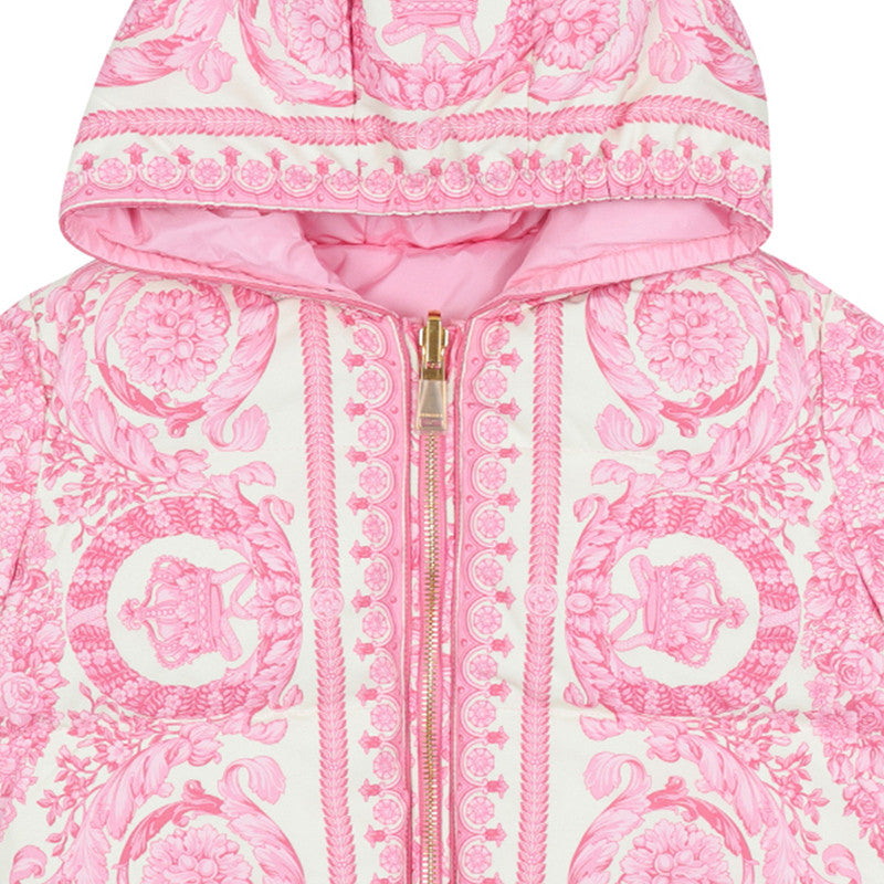 A warm reversible puffer jacket featuring a Barocco Foulard all-over print on one side and a monochrome color on the reverse with a tonal thread-embroidered Medusa motif at the chest.