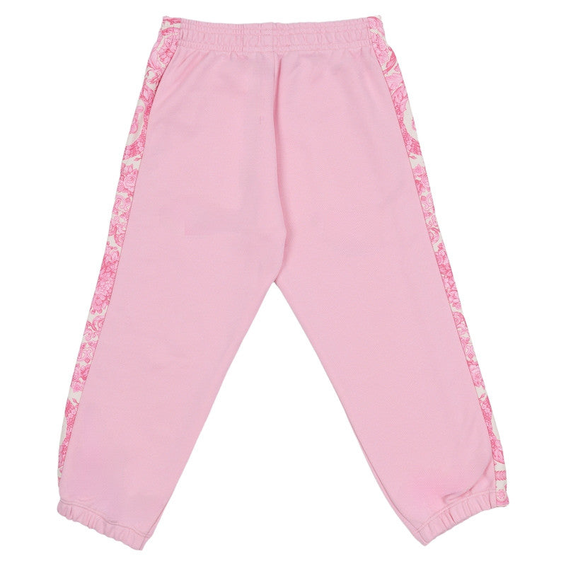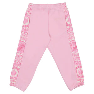These pale pink joggers are unmistakably by luxury Italian brand Versace, combining a sporty look with designer style. Made in soft, comfortable cotton jersey, they have silky side panels patterned with the brand's iconic Barocco Foulard design in pink and ivory. There are useful side seam pockets on the front and a tonal embroidered logo for a signature finish.