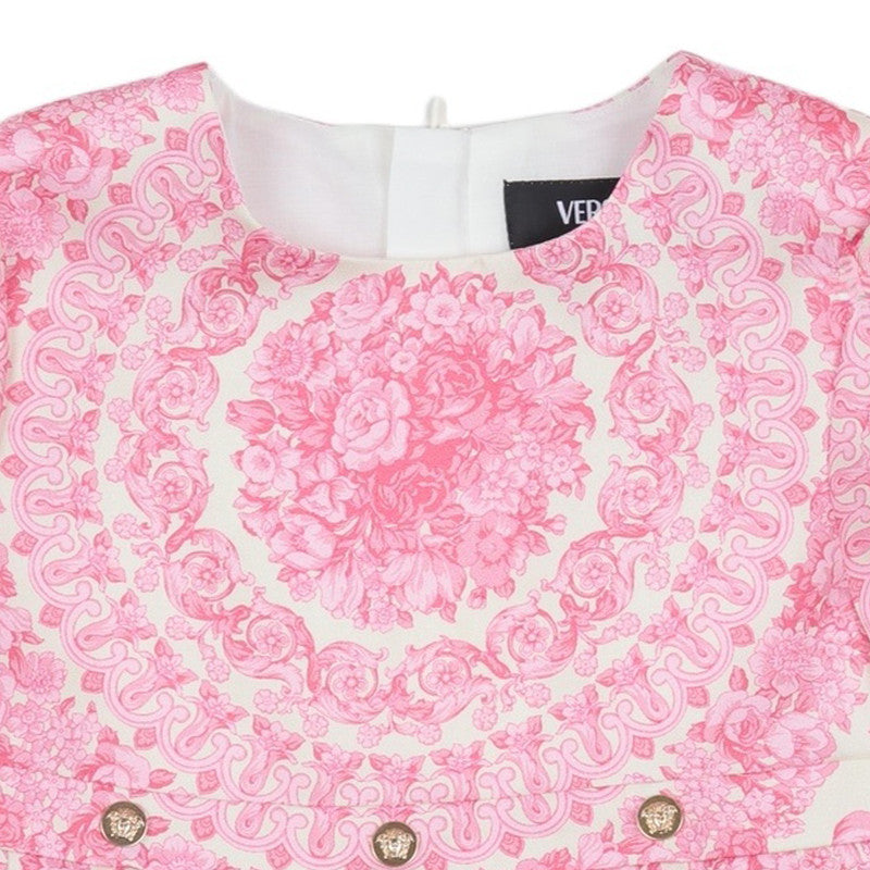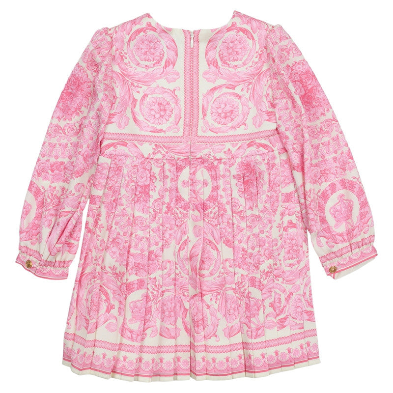 This beautiful pale pink and ivory dress by luxury Italian brand Versace, is made in silky satin. Patterned with the brand's iconic Barocco Foulard print, it has long puffed sleeves and a pleated skirt with signature, decorative Medusa buttons on the waistband in shiny gold.