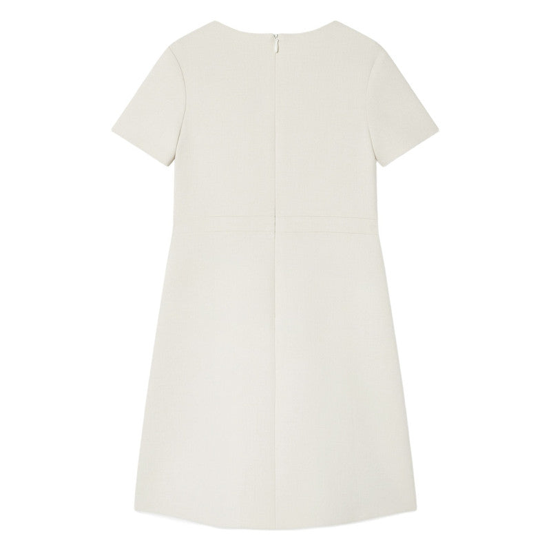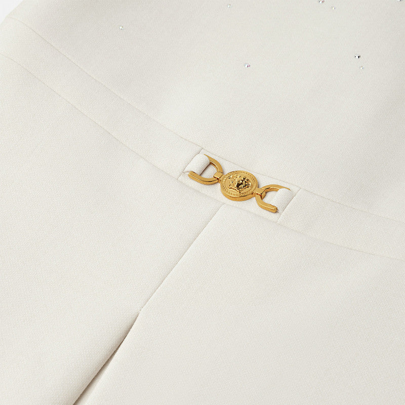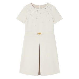 Elegant And Timeless, This Smart Beige Dress For Girls Is Unmistakably By Versace, With Gold Tone Medusa '95 Hardware On The Waistband. Made In Soft Viscose Blend Milano Jersey With A Lovely Drape, It Has Glittering, Iridescent Rhinestones Across The Chest And An Inverted Pleat On The Skirt.