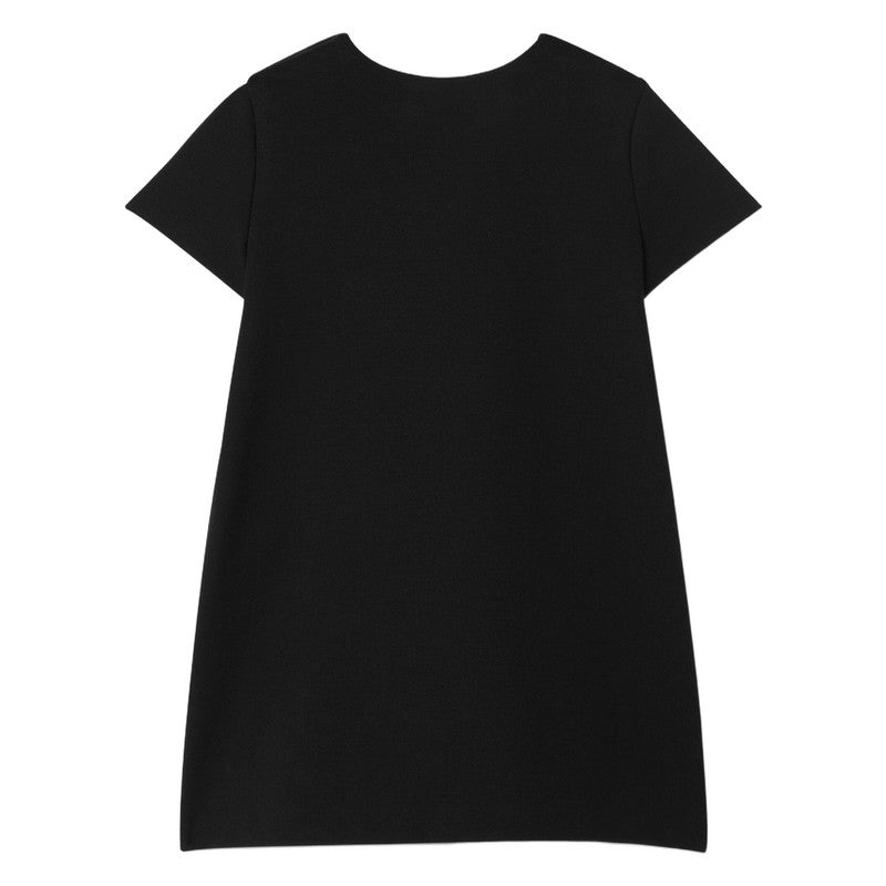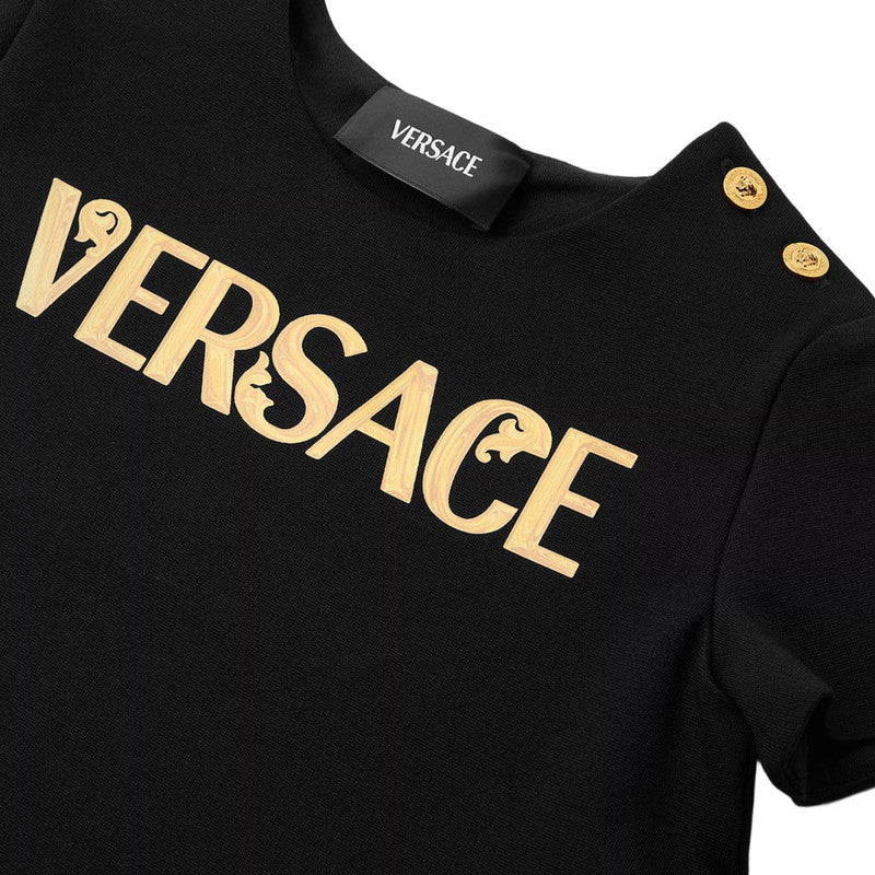 This Stylish Black Dress For Younger Girls By Luxury Italian Brand Versace, Blends Comfort With Iconic Designer Style. Made In Soft Milano Jersey, It Has A Sleek A-Line Silhouette, With A Striking Gold Logo Printed Boldly Across The Front. The Dress Fastens With Gold-Tone Medusa Buttons On One Shoulder For A Signature Finish.