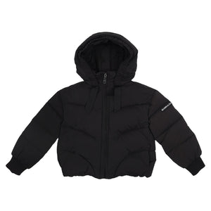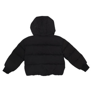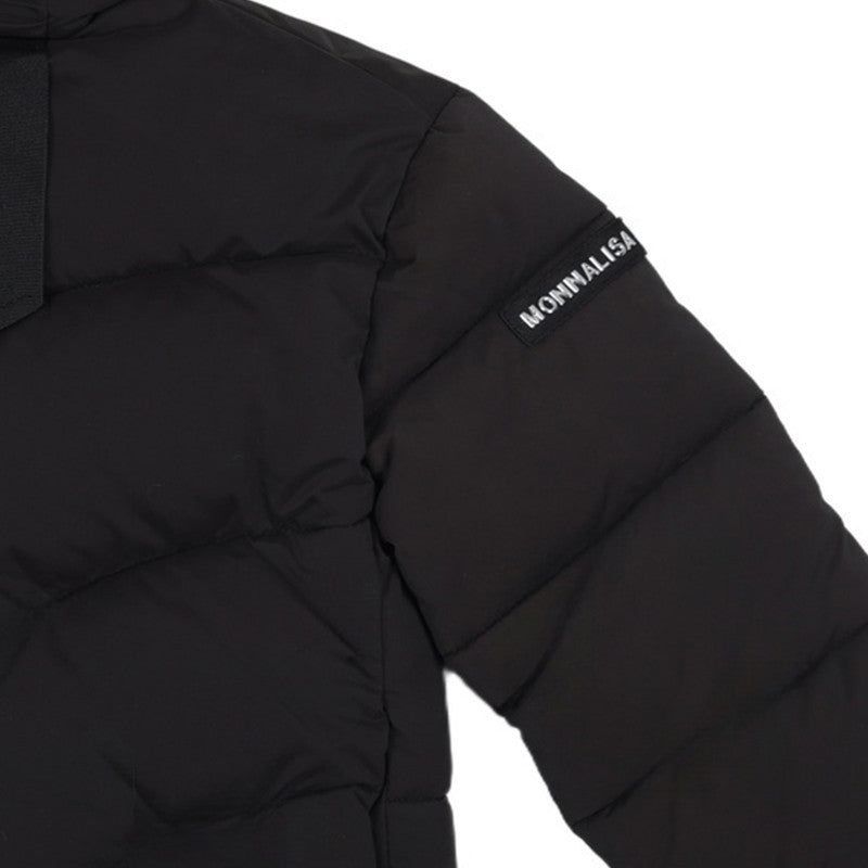 This black puffer jacket by Monnalisa offers warmth and style for girls. Its cosy, mid-weight padding and elasticated cuffs provide snug comfort, along with the attached hood, which features grosgrain ribbon embellishments.