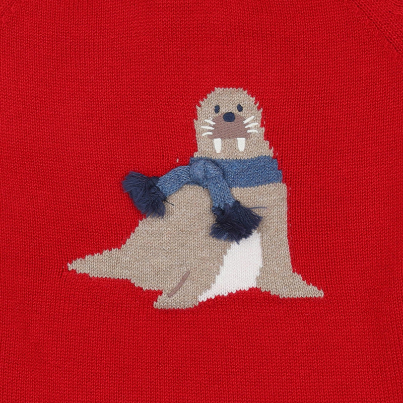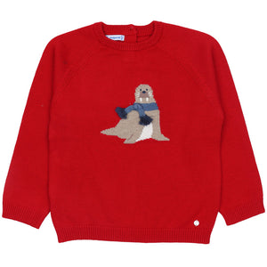 A cozy red knit pullover from Mayoral, featuring an adorable walrus motif with a textured scarf detail. Soft, warm, and playful—perfect for adding a pop of color and charm to cool-weather outfits